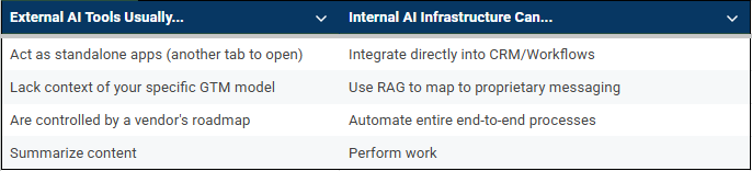 And to be clear, I still buy AI tools. I love tools like Gong or specialized ABM platforms. The distinction isn’t really “Build vs. Buy.” It’s more like Vertical vs. Horizontal.